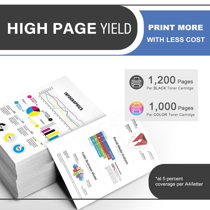 Cartridge yield (approx.): 1,200 pages Black, 1,000 pages Cyan, 1,000 pages Magenta, 1,000 pages Yellow, coverage rate of 5% (letter/A4)